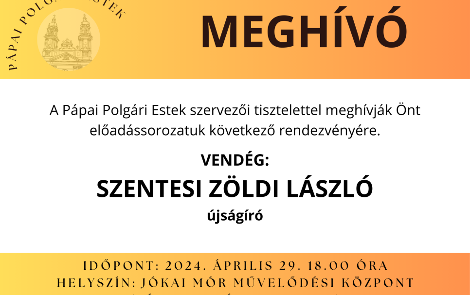 Itthon 2024. április 12. A Pápai Polgári Estek következő vendége: Szentesi Zöldi László újságíró Forrás: